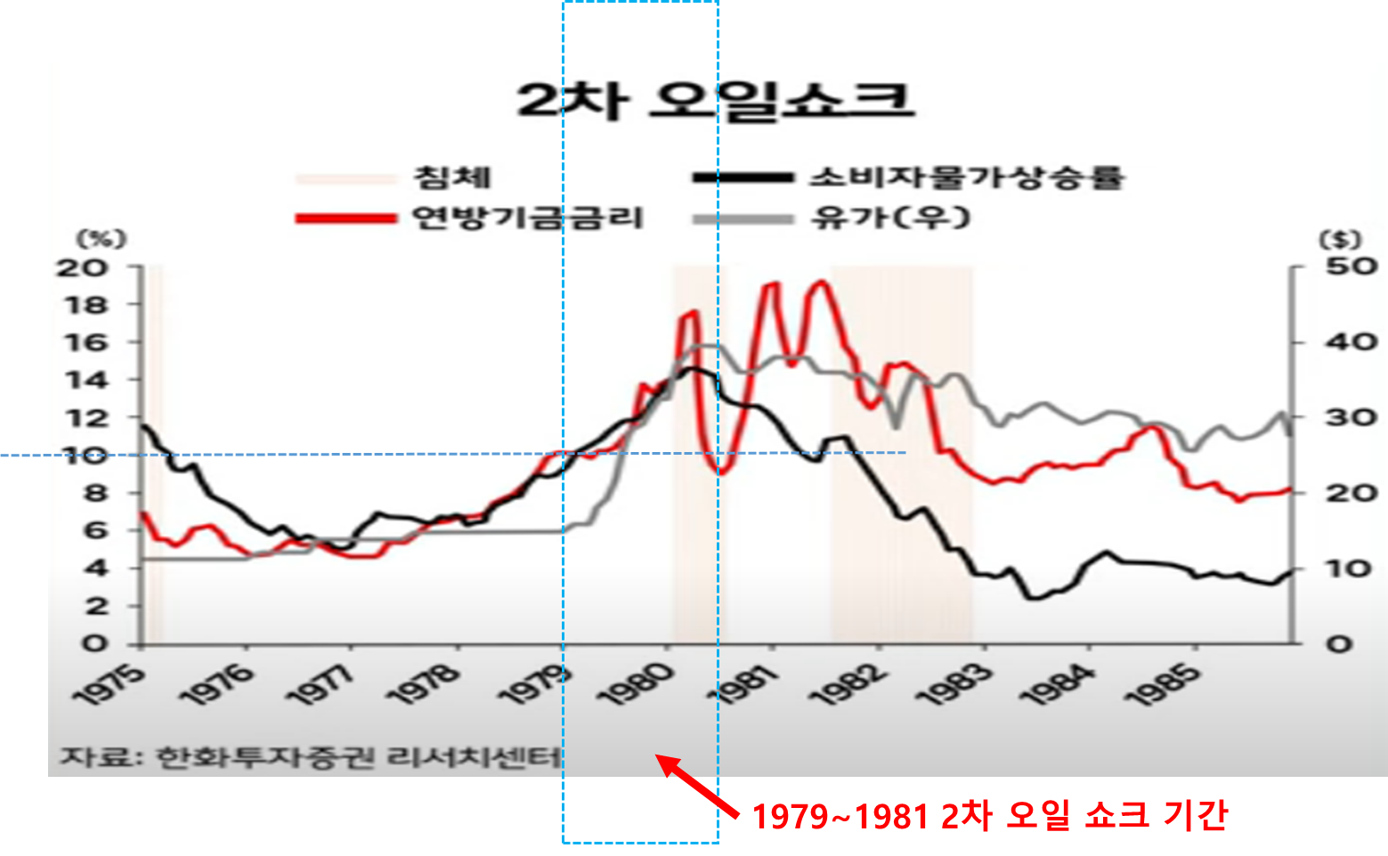 1979년 2차 오일 쇼크로 유가는 $40 까지 급등하며 인플레이션도 걷잡을 수 없이 치솟았다.